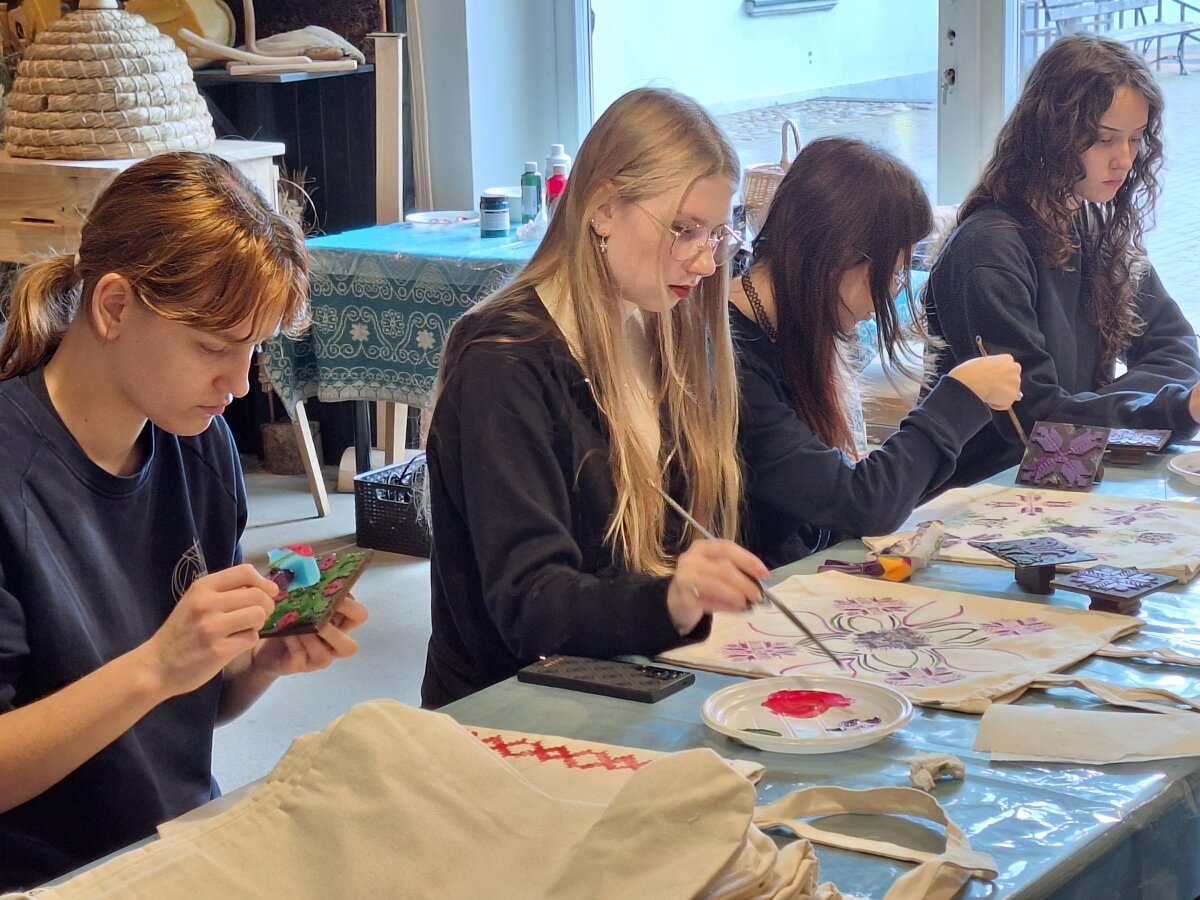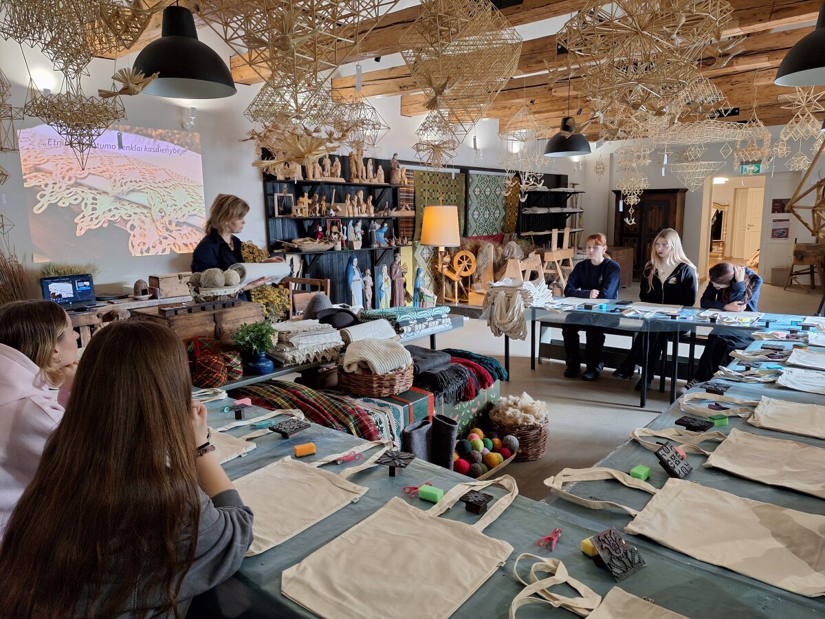 IV klasės mokiniai ir dailės mokytoja Lina Smailytė leidosi į netradicinę dailės pamoką – ne tarp mokyklos sienų, o kultūros ir istorijos apsuptyje. Jonavos kultūros centro Krašto muziejus atvėrė duris į praeitį, pakviesdamas į edukacinį užsiėmimą „Etninio tapatumo ženklai kasdienybėje“. Čia gimnazistai ne tik klausėsi pasakojimų apie lietuvių liaudies tekstilės tradicijas – jie gilinosi į pluoštų kilmę, spalvų simboliką ir raštų reikšmes, kurios pasakoja apie tautos dvasią. Ši patirtis virto kūrybiniu procesu: keliaudami istoriniu paveldu, mokiniai patys kūrė savas kompozicijas ant drobinių maišelių, derindami tradicinius raštus ir spalvas. Kiekvienas potėpis, kiekvienas ornamentas tapo jų pačių santykio su etnine tapatybe ženklu. Ši netradicinė pamoka – tai ne tik meninis eksperimentas, bet ir gyvas ryšys su kultūriniu paveldu, kurį mokiniai pajuto per kūrybą, spalvas ir prisilietimą prie istorijos.