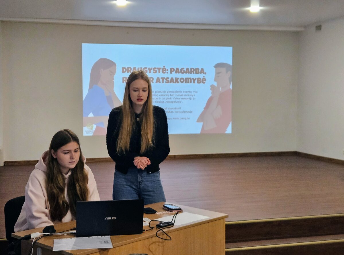 IIIa kl. mokinės Agata Kazimeranec ir Ieva Juknaitytė jau antrą kartą lankėsi Jonavos „Neries“ pagrindinėje mokykloje. Tęsdamos darnaus mokyklų bendradarbiavimo iniciatyvą, gimnazistės šeštokams ir aštuntokams vedė etikos pamoką ,,Draugystė: pagarba, ribos ir atsakomybė". Mokiniai raliečių labai laukė, o pamoka nenuvylė – ji buvo įtraukianti, smagi ir kupina gyvo bendravimo. Jaunosios mokytojos lengvai užmezgė ryšį: davė naudingų patarimų, padėjo atlikti užduotis, pasakojo apie gimnazijoje vykstančias veiklas, projektus. Toks susitikimas, įkvepiantis siekti savo tikslų, – tai tiltas į draugiškus tarpusavio santykius.