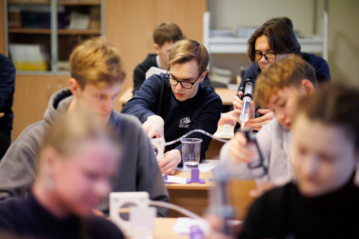 Tuo pat metu vyko ir praktiniai laboratoriniai užsiėmimai: FTMC mokslininkai dr. Vladislovas Čižas ir dr. Vytautas Jakštas kartu su mokiniais atliko laboratorinius darbus. Pamokos prabėgo nepastebimai – smalsumas, bandymai ir diskusijos neleido nuobodžiauti nė minutei.