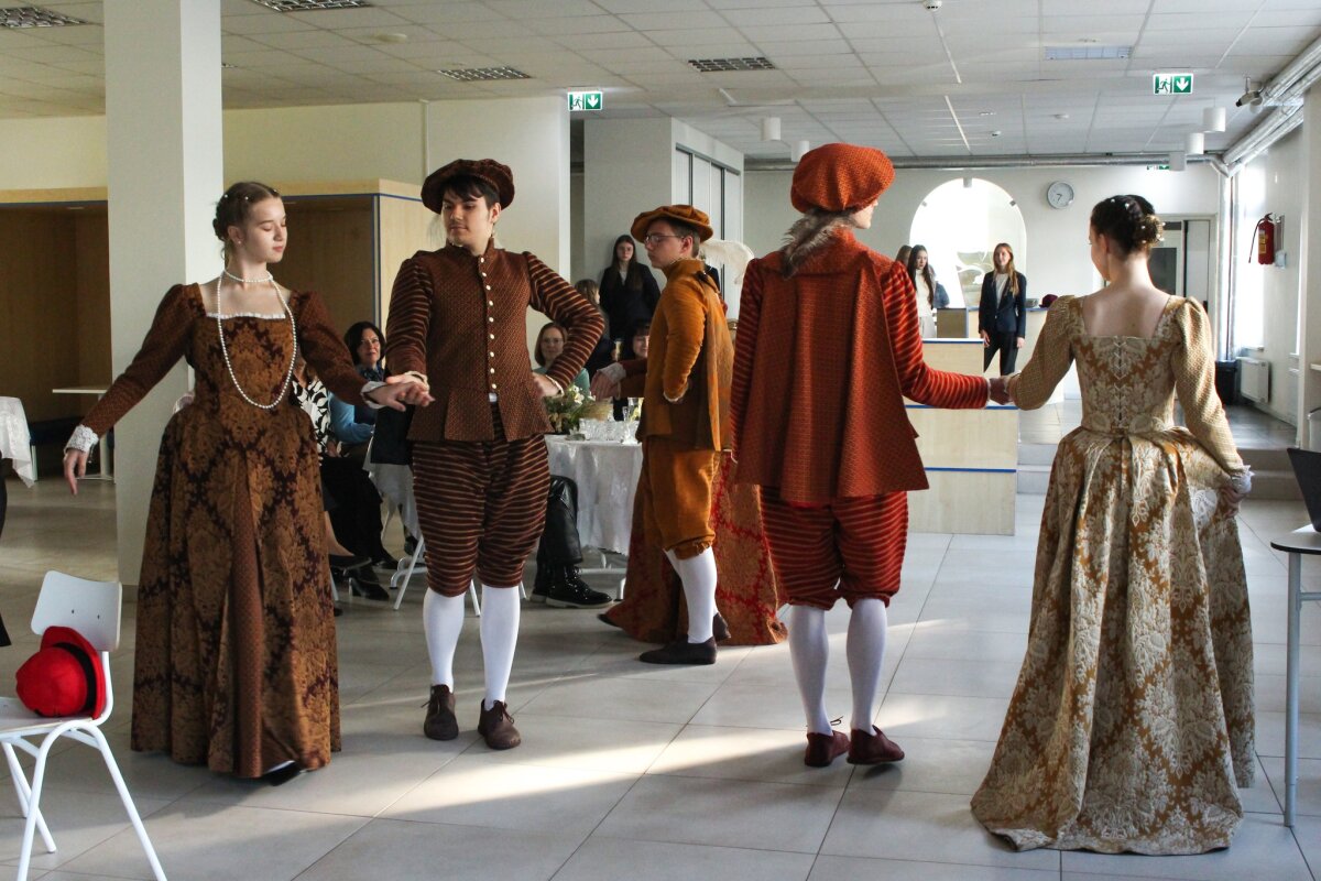 ,,Istorijos laiptais" – į tokią Mokytojo dienos šventę mūsų gimnazijos abiturientai pakvietė savo pedagogus. Renginys visus nukėlė į Renesanso dvasia alsuojančius laikus. Tarsi įspūdinguose tų laikų gobelenuose įaustos pačios gražiausios gijos: mokyklos erdvėse, virtusiose jaukiomis menėmis, skambėjo klavesinų, trombonų, valtornų, smuikų garsai, mokytojams įteiktos simbolinės dovanėlės – vėduoklės. Didele staigmena tapo Jonavos Janinos Miščiukaitės meno mokyklos istorinio šokio kolektyvo „Fioretti“ pasirodymas ir jų vadovės Živilės Antanavičienės emocingas pasakojimas apie senųjų laikų šokių pradininkus bei elegantiškus šokius. Mokytojai sugebėjo darniai įsilieti į „Fioretti“ kolektyvą ir sušokti net du šokius.